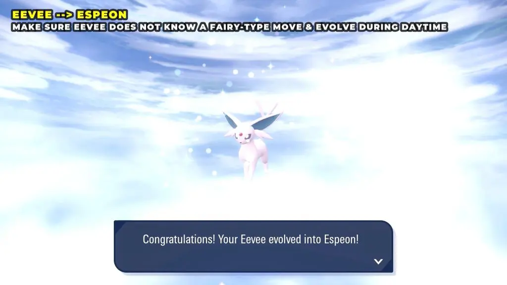 Eevee evolves into Espeon during the daytime once its friendship level is high. Be sure that Eevee doesn’t know Disarming Voice or any other Fairy-type move before evolving. You’ll know Eevee is ready when a small arrow appears next to Eevee in the party menu.