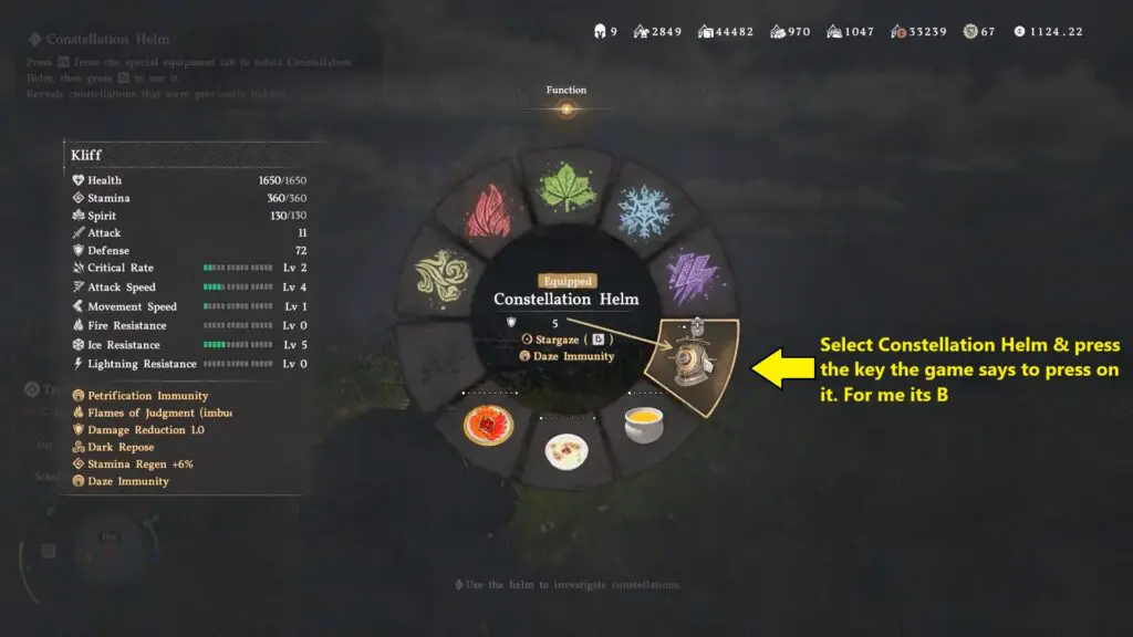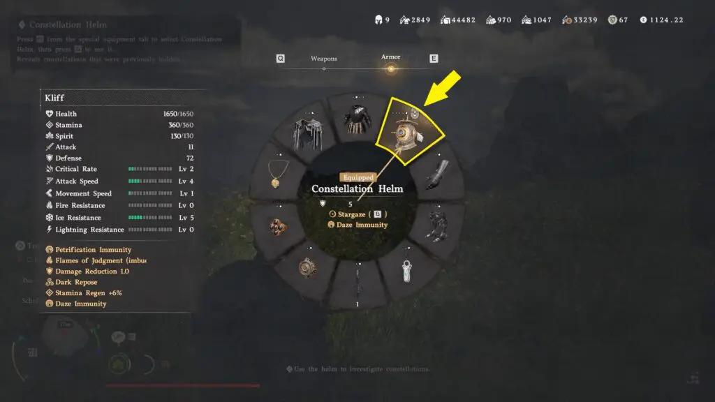 You’ll find a strange-looking helmet on the ground called the Constellation Helm. Pick it up and equip it. Open your gear menu and put the Constellation helm on your character.