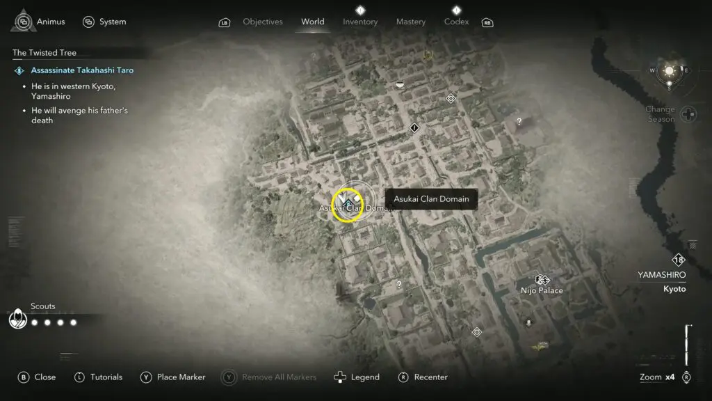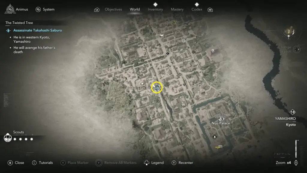 Takahachi Saburo can be found in western Kyoto, Yamashiro (east of Asukai Clan Domain)