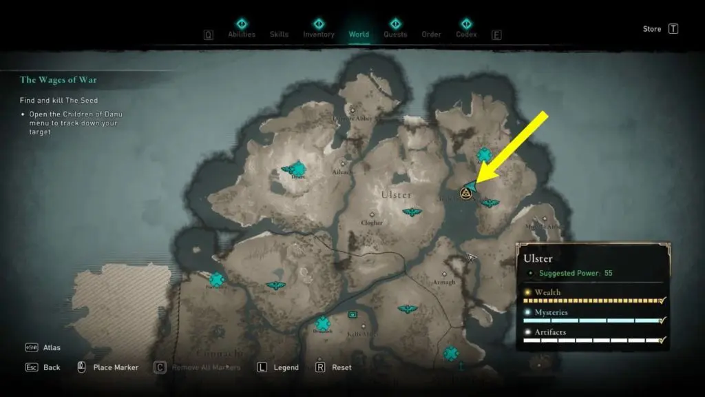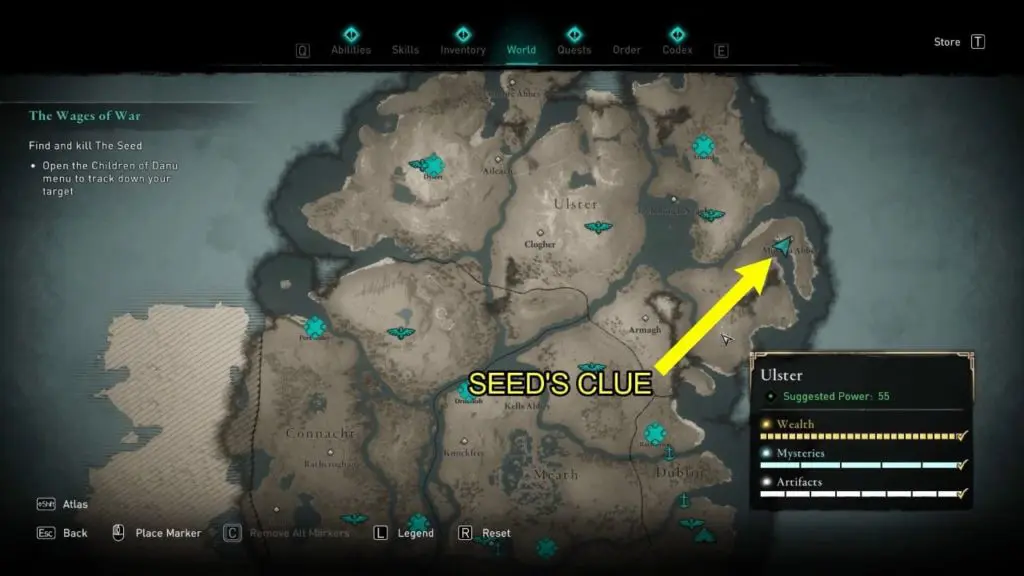 Now, the Seed’s identity has been revealed. Open the Children of Danu menu and mark the target to track his location. The Seed is in the Dunseverick Fortress (in the north-east corner of Ulster).