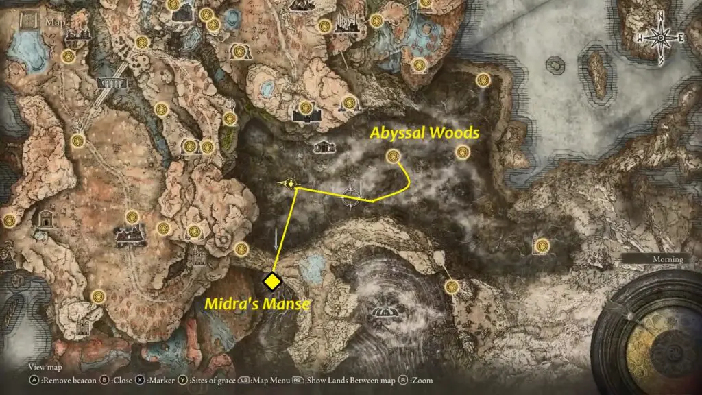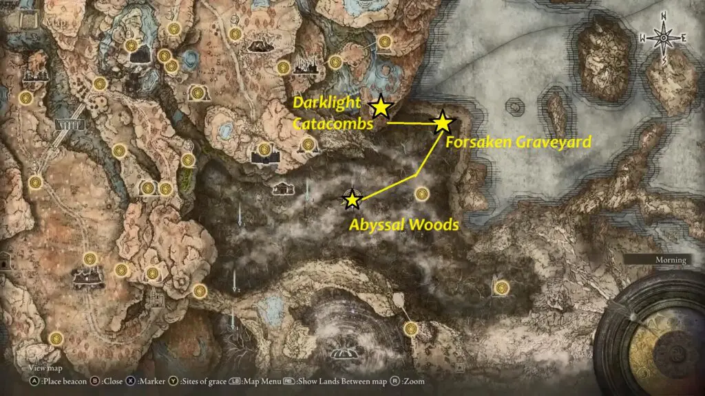After defeating this boss, you’ll find a Sight of Grace named The Forsaken Graveyard. Follow the open water path straight ahead from here, then head west and run along the water. This will lead you directly to another Sight of Grace: Abyssal Woods.