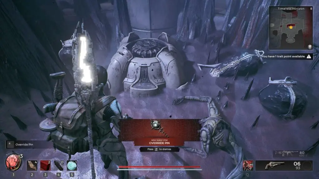 Proceed straight ahead and use the third and final elevator to travel down and collect the Override Pin in Remnant 2.