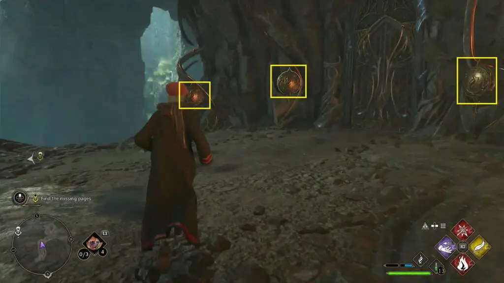 Hop off the floating platform and take the path going left until you reach another blocked path. Defeat the spiders there and hit the three plates as shown in the picture below. This will clear the path. Continue through the bridge ahead. Then pick up the Missing Pages from the ground to complete the objective.