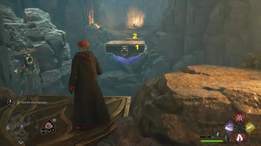 Go through the door and proceed in the cave until you reach a floating platform as shown in the picture below. Use Accio spell to pull the platform towards you. Hop on the platform and use Accio on the platform straight ahead (Marked as 2 in the picture below). This will take you to the other side.