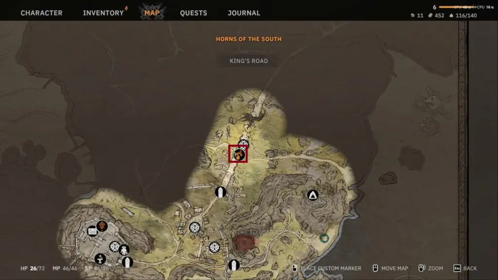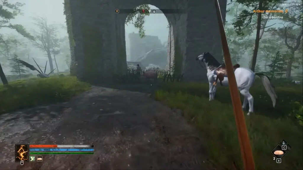 To find the free horse in Tainted Grail: The Fall of Avalon, begin your journey at the main starting area of the game. From there, travel northwest by following the main road. Continue along this path until you reach a large bridge. Refer to the map below of the King’s Road. Go beneath this bridge to find a small outlaw camp.