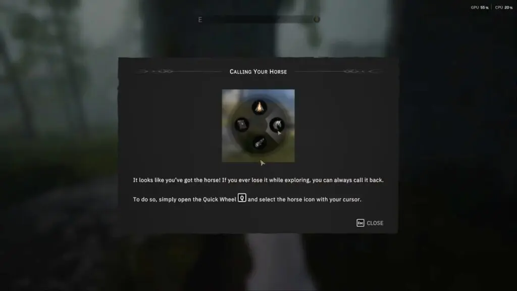 To call your horse back, hold the Q key (or open your menu wheel ). From there, select the horse icon in the radial menu. Your horse will then return to your location immediately.