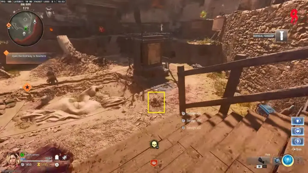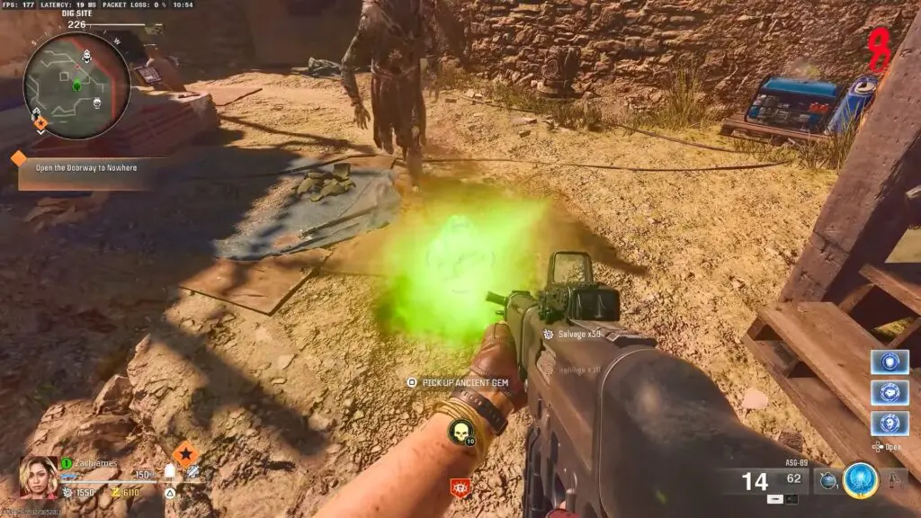 In the spawn area at the dig site, open the door to the left and go inside. Interact with the machine to buy Death Perception, which lets you see the ancient gem you need to dig up.