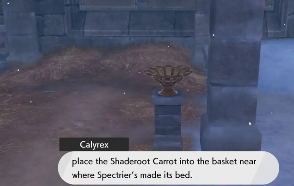 The Spectrier is part of the Crown Tundra’s story. You must accept “Legendary Clue 1” from Peony to encounter Spectrier. During the story mission, you’ll need to plant the Carrot Seeds in the haunted soil to summon Spectrier. Since Spectrier is bonded with Calyrex at first, you’ll need to separate Calyrex from Spectrier to use