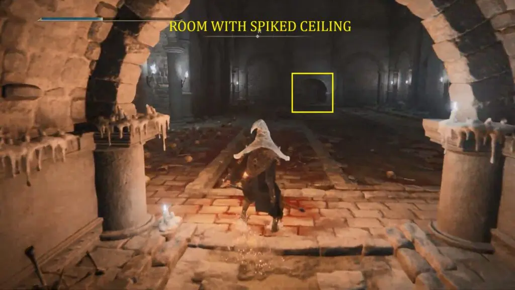 Enter the Catacombs and go down using the elevator to activate the Site of Grace. Proceed ahead into the first larger room. Proceed with caution here, since entering the space will cause the spiked ceiling to come down. As soon as you enter the room, pull back to set off the spiked trap. Once the trap releases run quickly to enter the next tunnel.