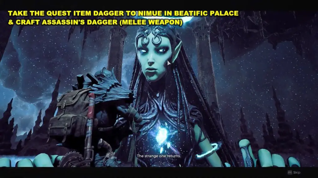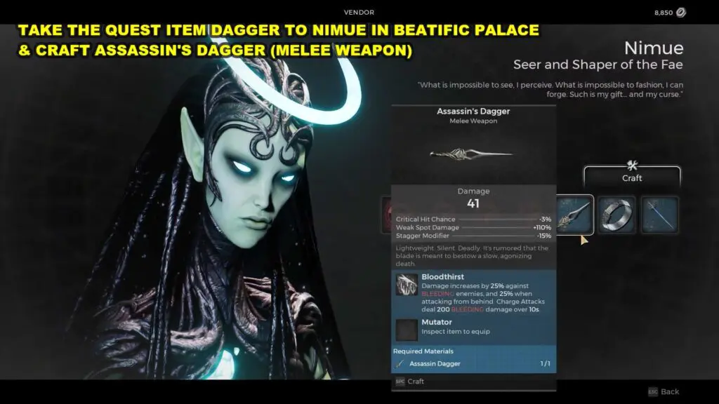 In case you choose not to give the dagger to the council member, you can proceed to Nimue’s Retreat and speak with Nimue to craft the Assassin Dagger.