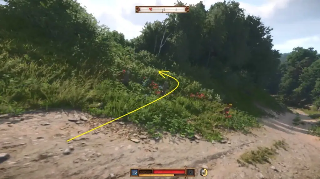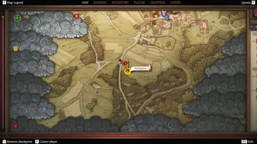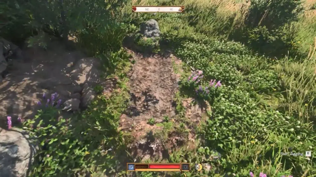 Go behind the bushes near two freshly cut tree stumps. Behind the bushes, look for a grave near a stone—when you get close enough, the game may mark it as a fresh grave.