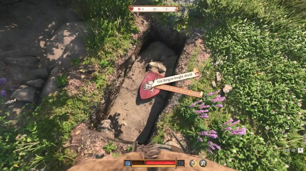 Use the spade to dig it up, and inside, you’ll find a high-quality shield, decent armor, and a heavy mace.