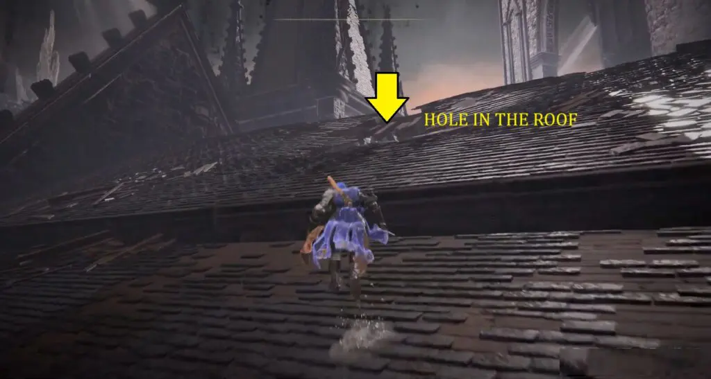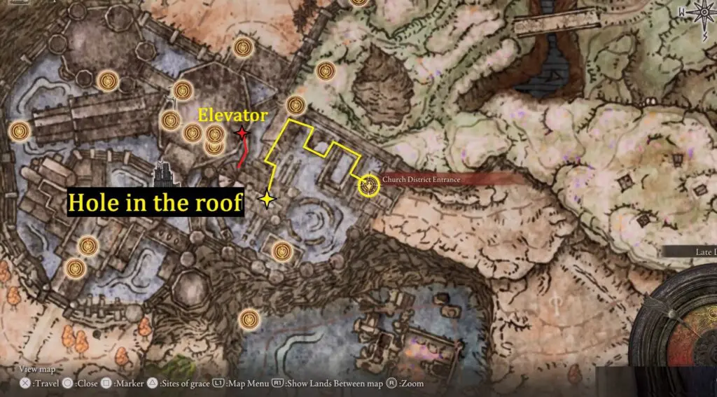 Begin at the Church District Entrance Site of Grace and follow the parkour across the rooftops as shown in the image. Continue until you reach a broken section of the roof of one of the buildings.