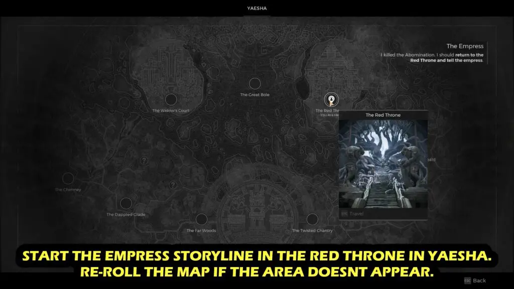 Head to Red Throne in Yaesha and start the Empress Storyline. If the area doesn’t appear on the map then you’ll need to reroll the map.