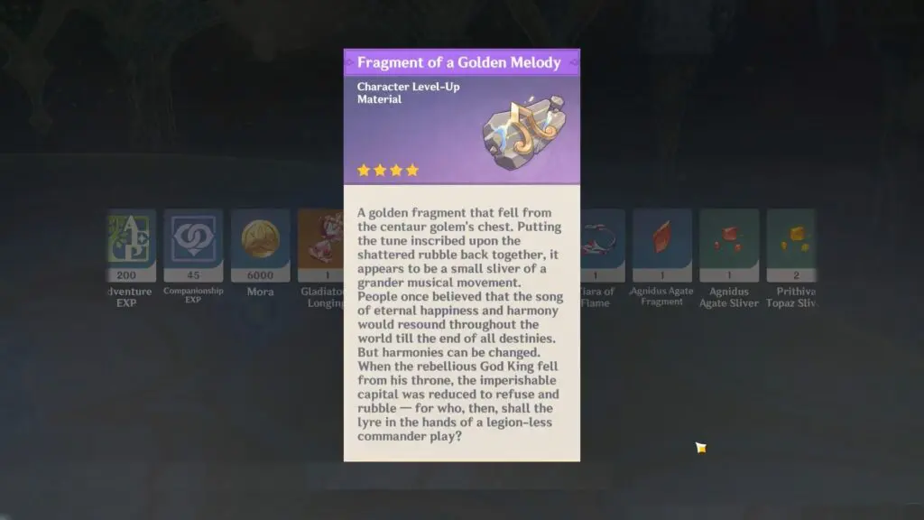 Fragment of a Golden Melody is a Character Level-Up Material. This article will guide you on how to obtain Fragment of a Golden Melody in Genshin Impact 4.6