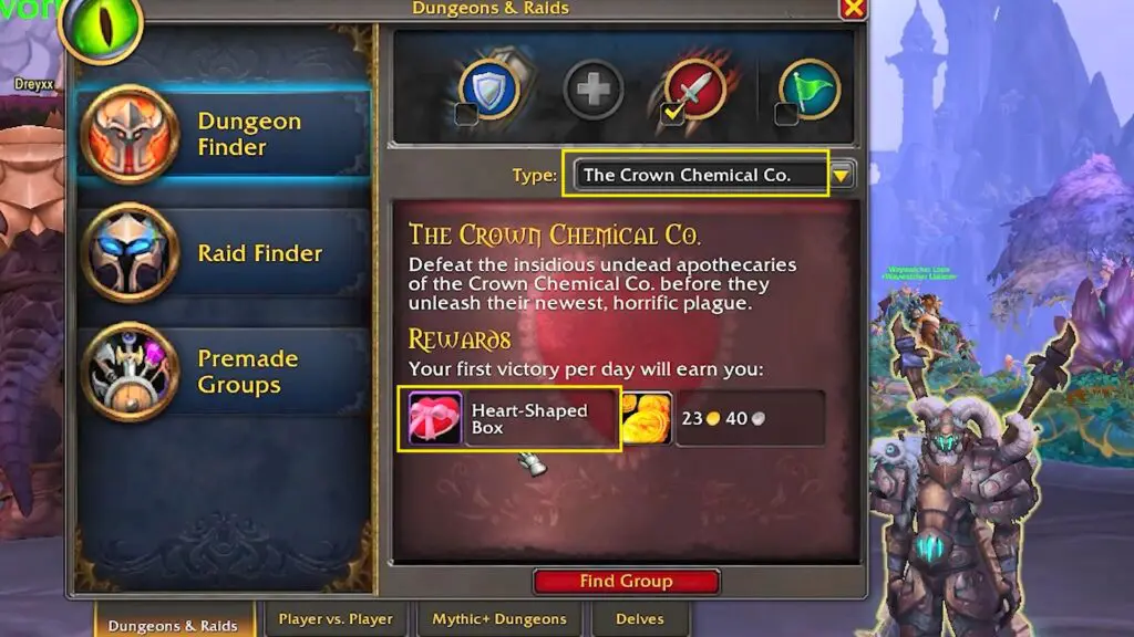 Open the Dungeon Finder and choose the Crown Chemical Company Dungeon. Each day, you can earn a Heart-Shaped Box, which contains Love Tokens and might even have the Love Witch’s Sweeper mount inside!