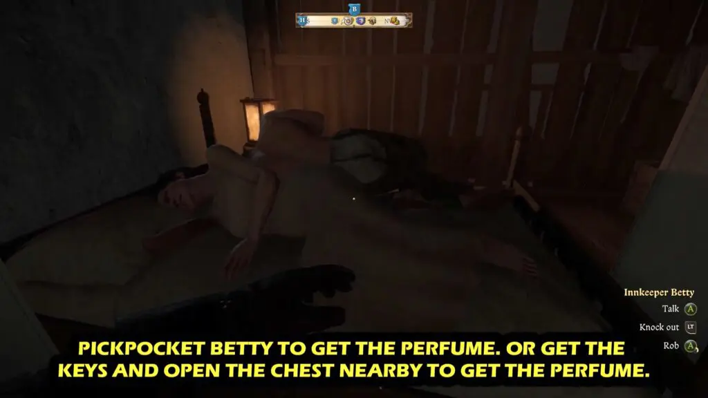 Speak with the Innkeeper again, and if your stats are high enough, she will give you the perfume. Alternatively, you can steal it from her after midnight when she is asleep. You can find her asleep on the second floor of the tavern.