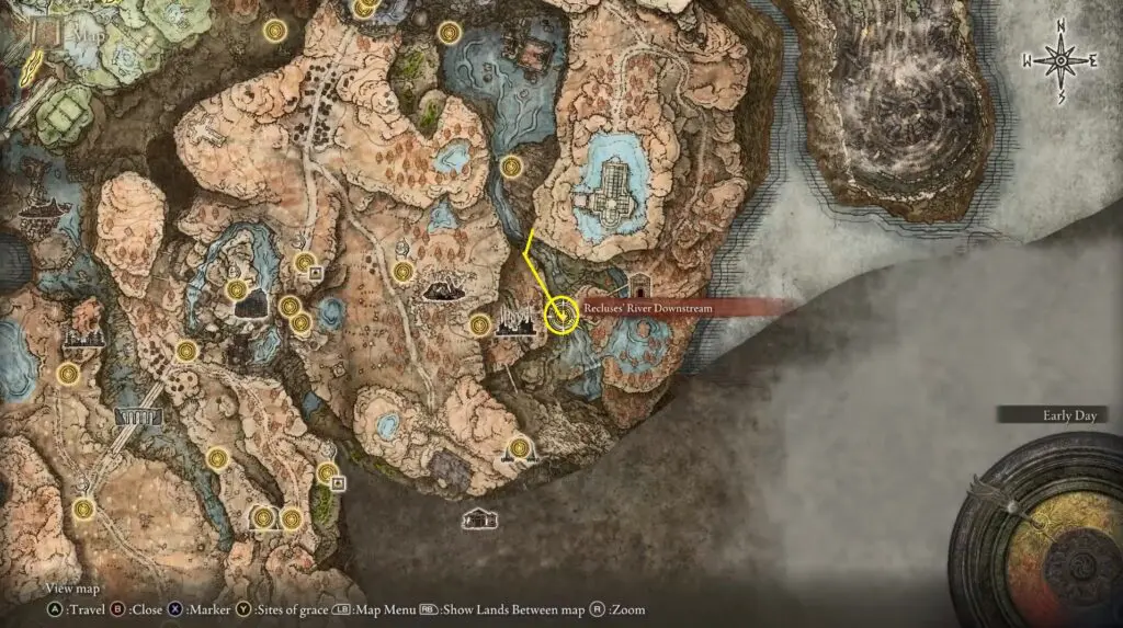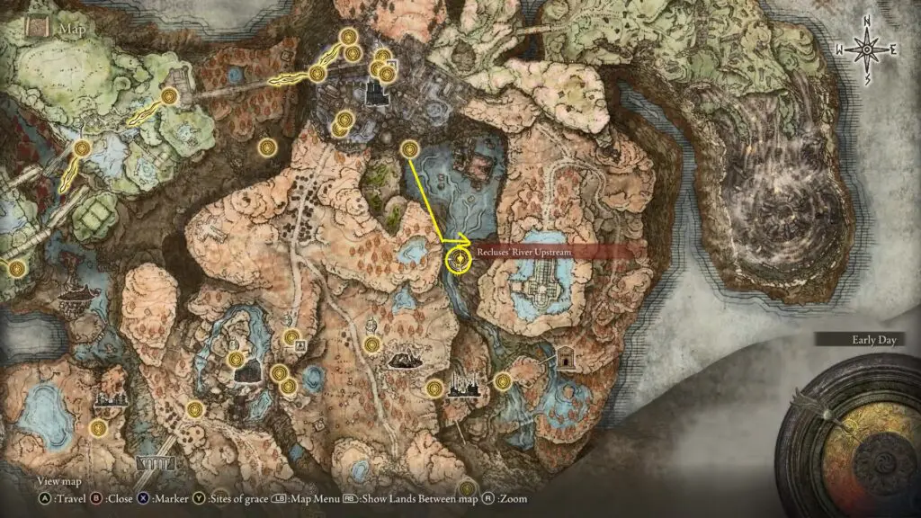 Follow the path in the south direction on the right side along the water. Upon reaching a waterfall, go to the left side where you’ll find another Site of Grace.