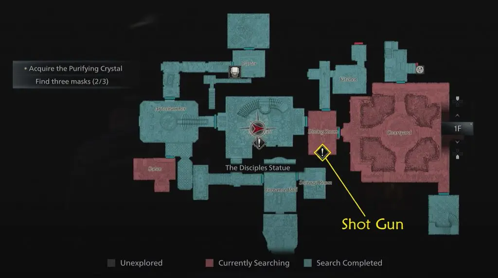 Now, make your way back down to the dining room. Use the triocular key here to unlock a shotgun.