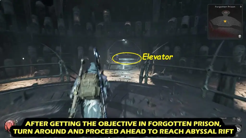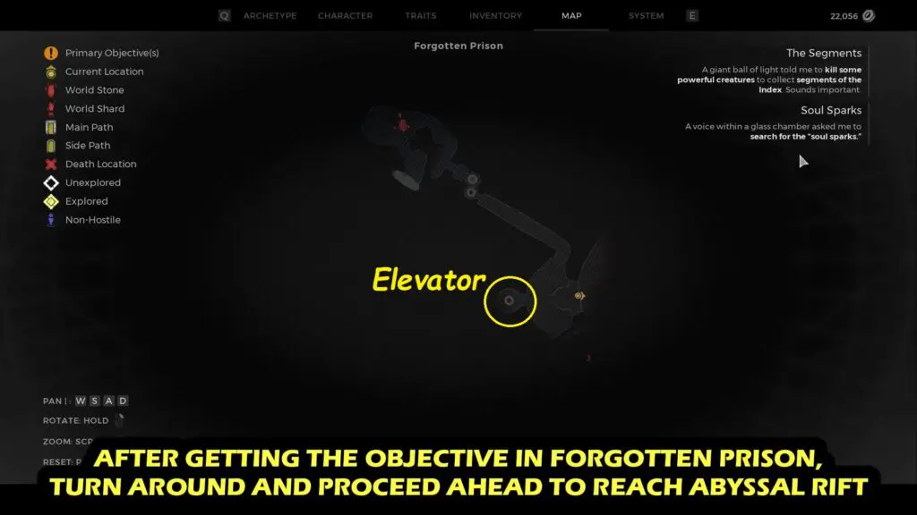 When you receive the objective to find the Soul Sparks in Forgotten Prison, turn around, take the elevator to go up, and proceed to the Abyssal Rift.