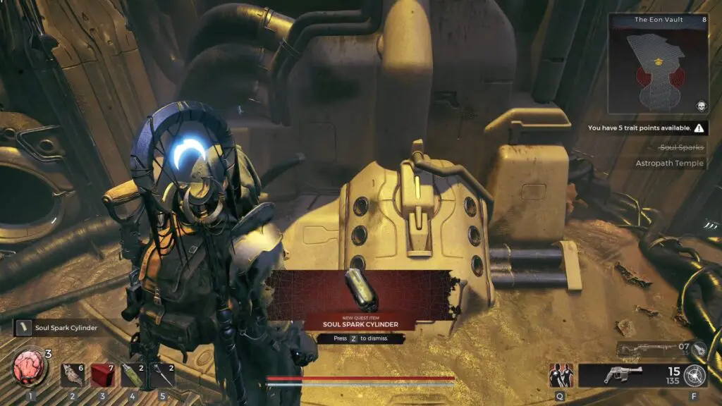 Head inside the structure, go down the elevator, and proceed to the end of the hall to obtain the Soul Spark Cylinder.
