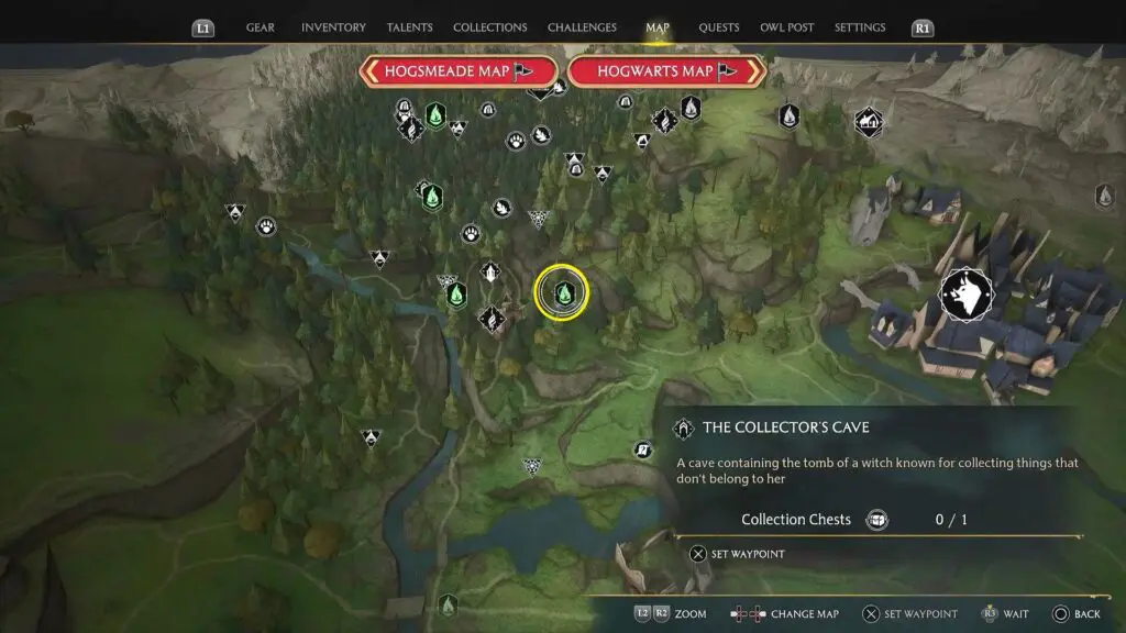 This guide shows how to get the collection chest in Collector’s Cave in the Hogwarts Legacy game, which was released on 10th February 2023. The Collector’s Cave is a cave located in the eastern part of the North Hogwarts region as shown on the map.