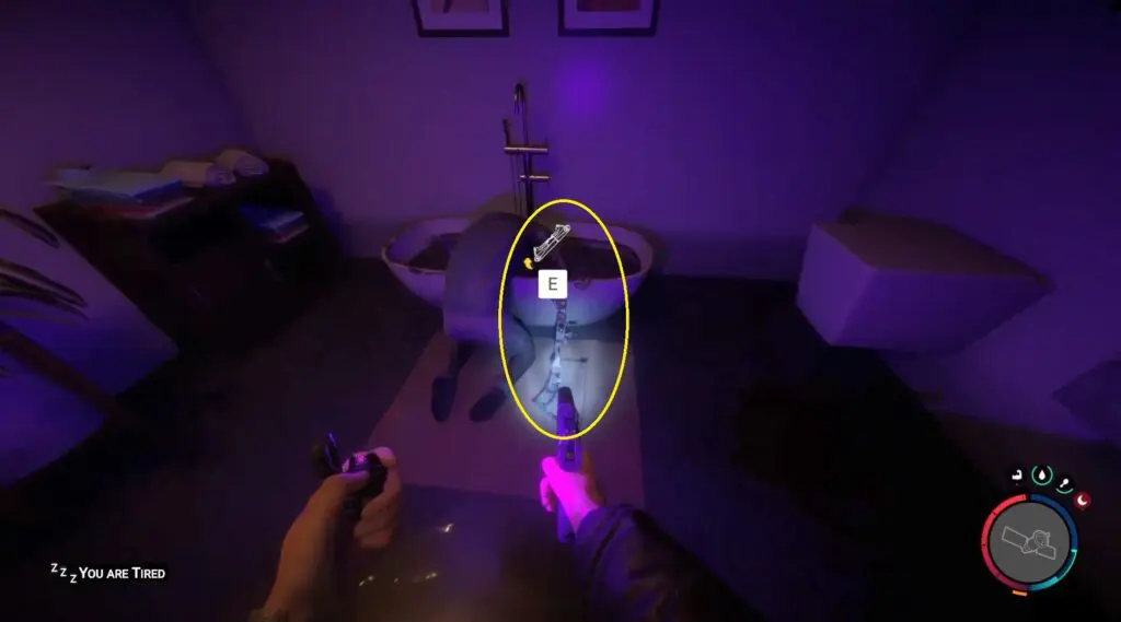 Enter the room and go to the far-right side to find a bedroom. Then continue into the bathroom to find the Compound Bow on the ground next to the corpse leaning over the bathtub.