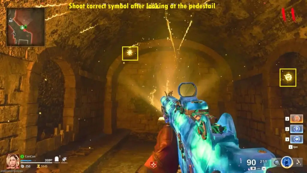 Look at the pedestal to see the symbol corresponding to the orb that needs to be hit. Shoot the orbs corresponding to the symbols. Repeat this process until you shoot all four different kinds of symbols.
