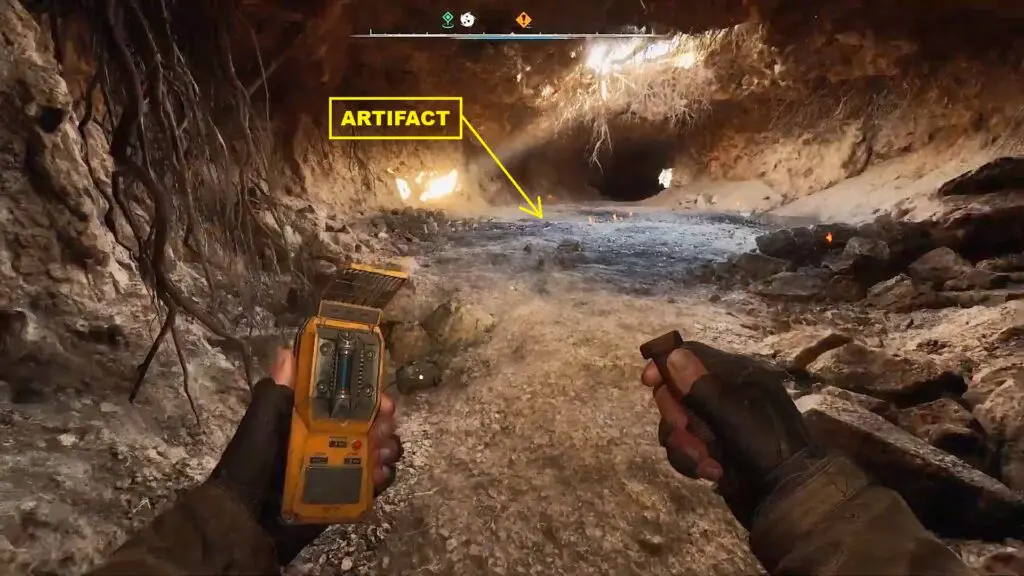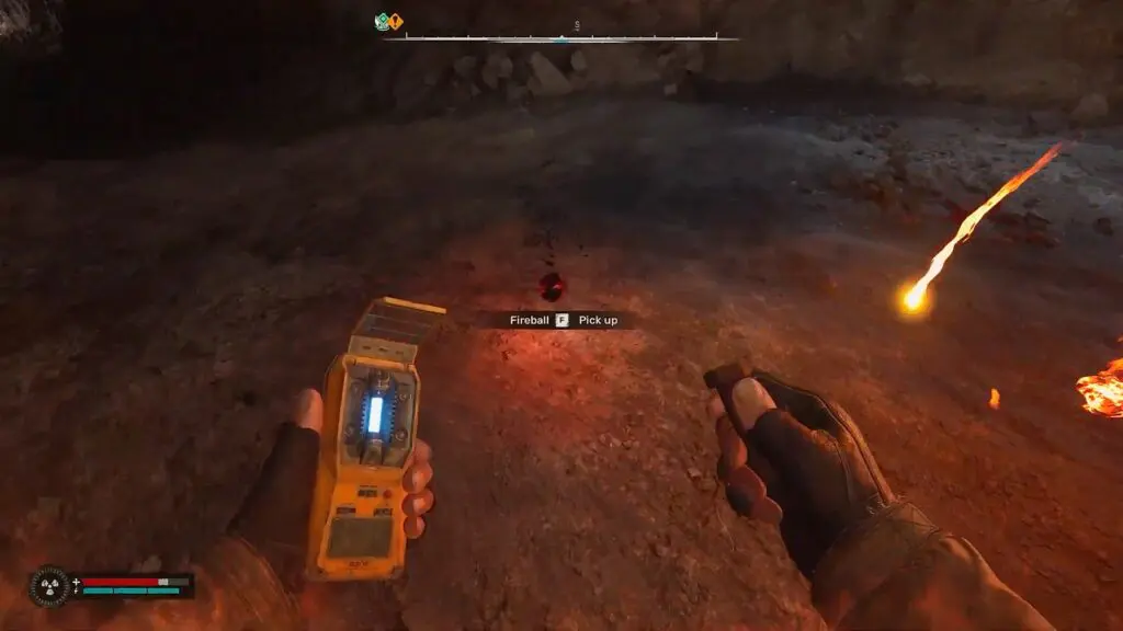 Proceed in the cave until you reach the room filled with fire. The artifact you are looking for is on the left side of the cave, as shown in the picture below. Now, press ‘Q’ (For PC) to equip the Echo Detector device. The device will start beeping. Slowly move towards the marked location on the left side of the cave. Go in the direction in which the beeping increases. When the beeping has intensified to the max, stand for a few seconds and a Fireball Artifact will spawn as shown in the second picture below. Please note that you need to have the Echo Detector device equipped and you also need to stop for a few seconds for the Fireball Artifact to spawn. Pick up the Fireball Artifact to complete the objective. You need to pick it up quickly otherwise it will disappear, and you will have to follow the beeper again to find it. It will spawn again nearby if you couldn’t catch it before.