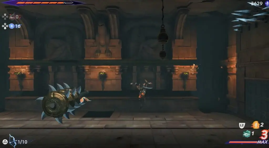 - Final sequence: Two normal bottom blades and one rotating blade meet in the middle. Afterward, the normal blades return to their path while the rotating one continues left. Stand on the left side, and use the wall jump at the right time to pass through.