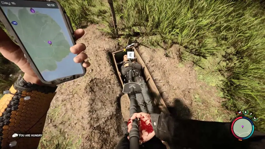 Use your shovel to dig the ground near the grave, and you will find a dead body in a wooden coffin along with a shotgun inside.