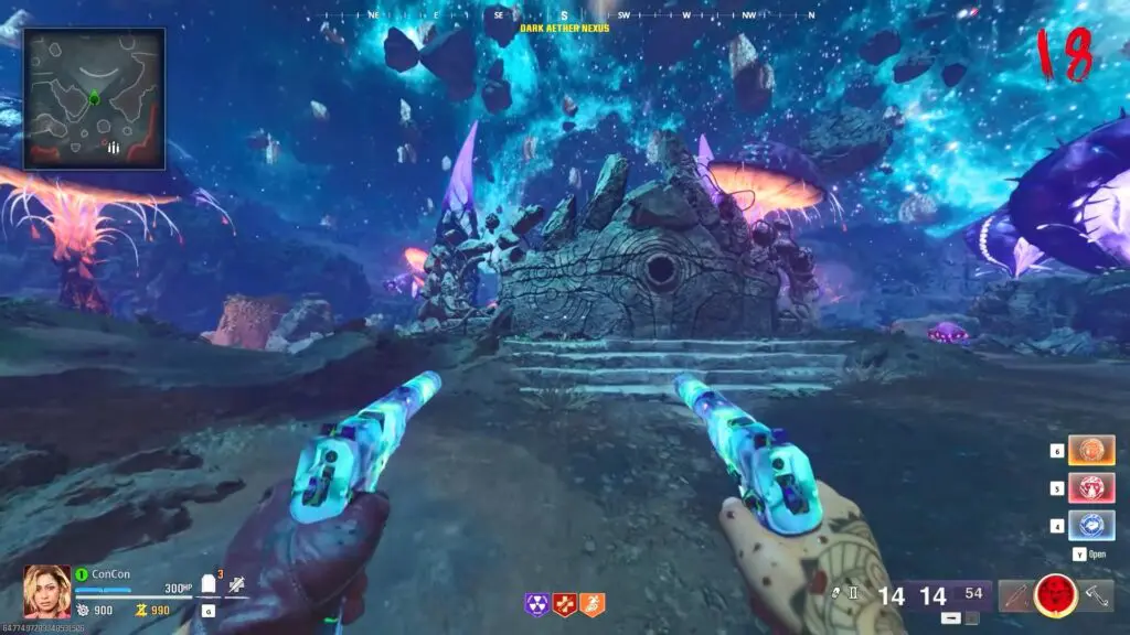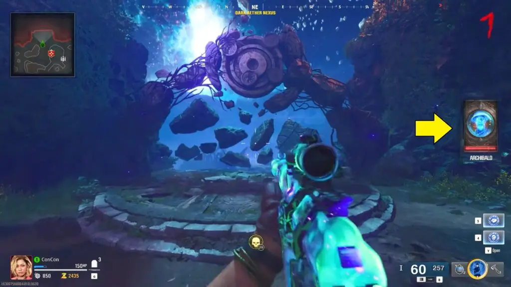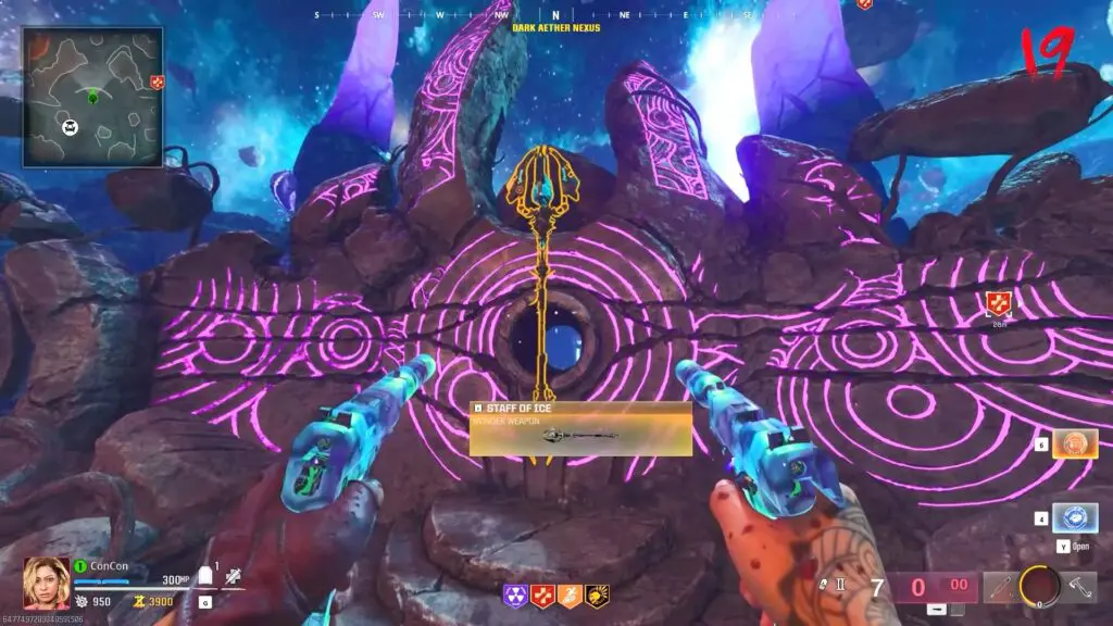 Once you have the Monocle, the staff base, and the headpiece, go to the Dark Aether Nexus area. Find the big stone near the Pack-a-Punch and interact with it to start a one-minute survival challenge. Fight off enemies and keep them away from the staff. If you do this successfully, you’ll get the Staff of Ice!