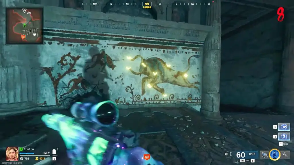 Now, you need to make the symbols on the bull painting glow. Look around the area for a purple light. To move the light, shoot it, and it will appear somewhere else. Keep shooting it until it lights on the lamp in front of the bull painting. When it’s in the right spot, the symbols on the painting will light up.