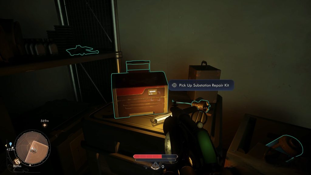Once inside, explore the small maintenance area to locate the Substation Repair Kit. It is on the workbench inside the room. Grab it, then climb back up the ladder to return to the main level of the power plant.