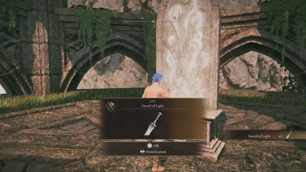 Players can raise a Stone-Sheathed Sword/Sword of Darkness at the altar in the Ancient Ruins of Rauh to get the Sword of Light. The location is marked below.