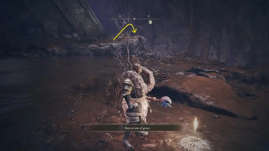 From The Fissure Site of Grace, go east, and soon you will reach the Stone Coffin Fissure Site of Grace. From there, take the path going down in the south direction. Follow the path and it will take you to the Fissue Cross Site of Grace as shown in the picture below.