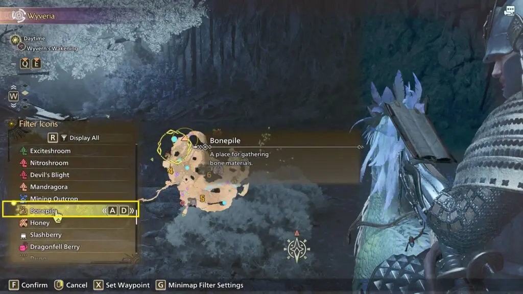 As Tough Guardian Bones are harvested from Bonepiles and monsters, you can’t search for them directly on the Map. However, you can set a path to any Bonepile or monster in the area by using the Filter Icons. Refer to the below image.