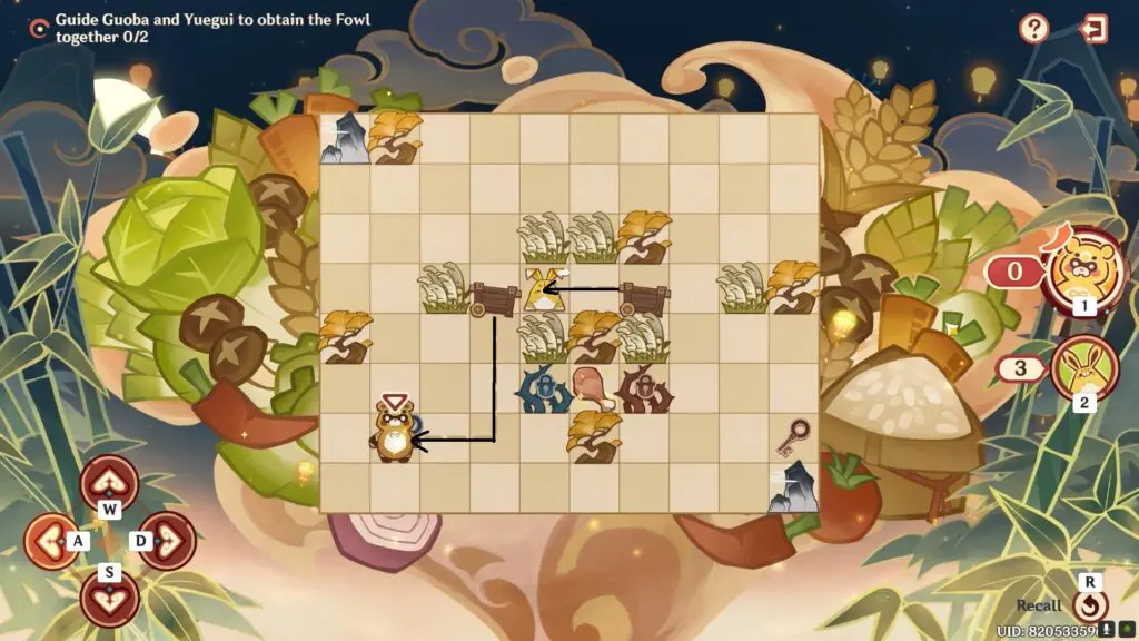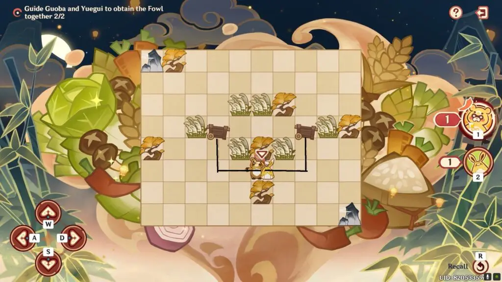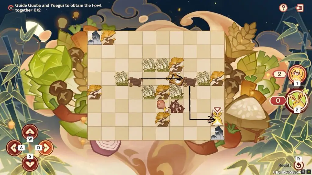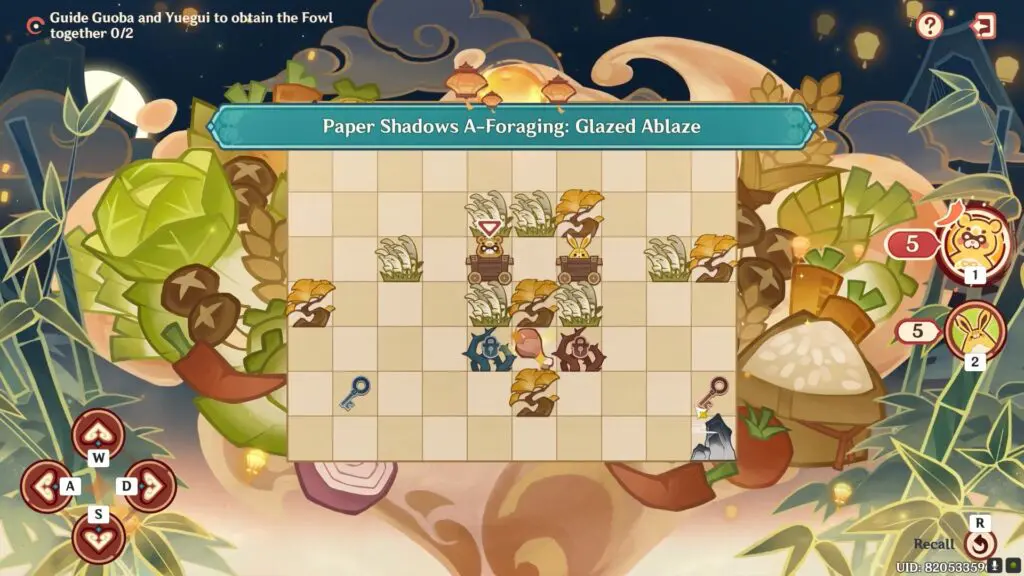 In the seventh stage of Paper Shadows A-Foraging, you must assist Guoba and Yuegui in obtaining the Fowl. Guoba and Yuegui have 5 steps each to reach the Fowl.