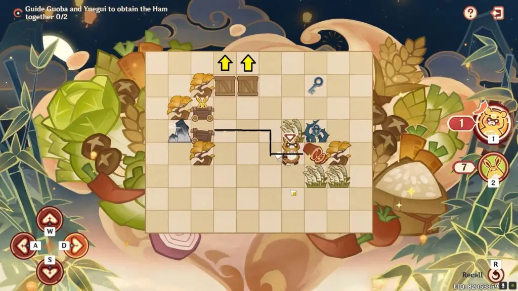 After Guoba has reached the ham, make Yuegui to move in a straight line and then push the crate up to retrieve the key. This will clear Yuegui’s path to the ham. Refer to the image below.