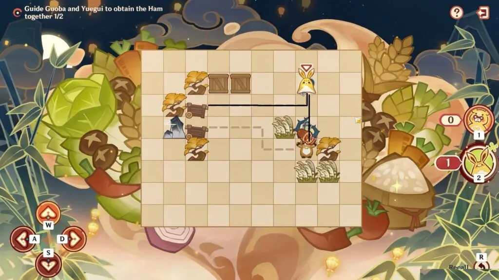 Start with Guoba and push both the crates upwards to create a path for Yuegui. Also, make Guoba to reach the ham. Refer to the image below.