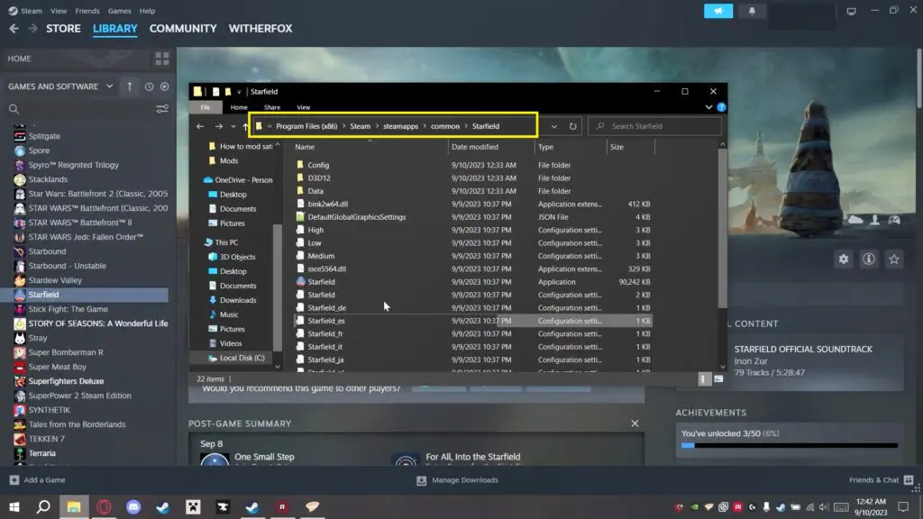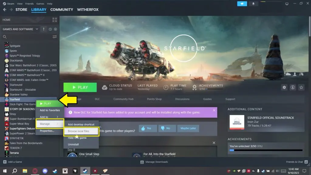 - For Steam: Right-click on Starfield in your Steam library, select ‘Manage’, then ‘Browse Local Files’. Note the folder location.