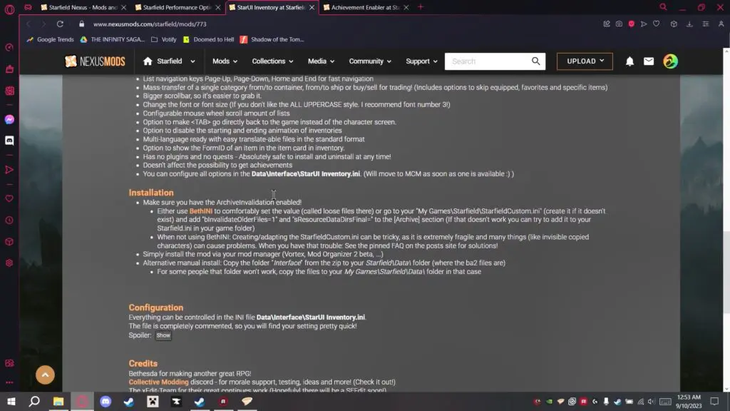 - Ensure archive invalidation is enabled in the Starfield custom.ini file.