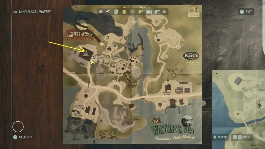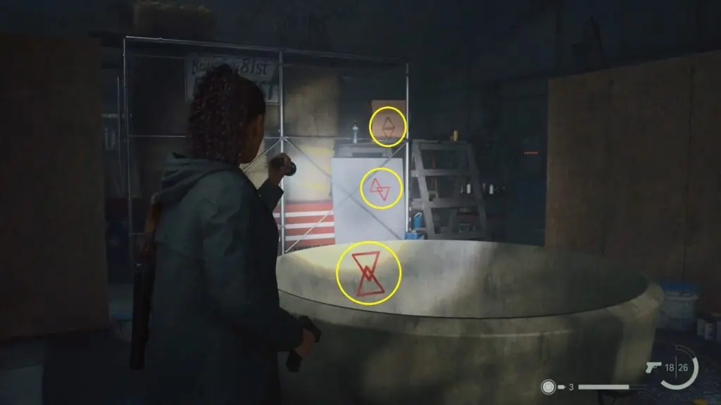 To find out how to turn the discs to the right symbols, fans must go to a big coffee cup sculpture in the southeast corner of the workshop. Stand between the sculpture and the wall. Then, look at the unfinished frames in the middle of the room. You’ll be able to see all three cult symbols from this spot.