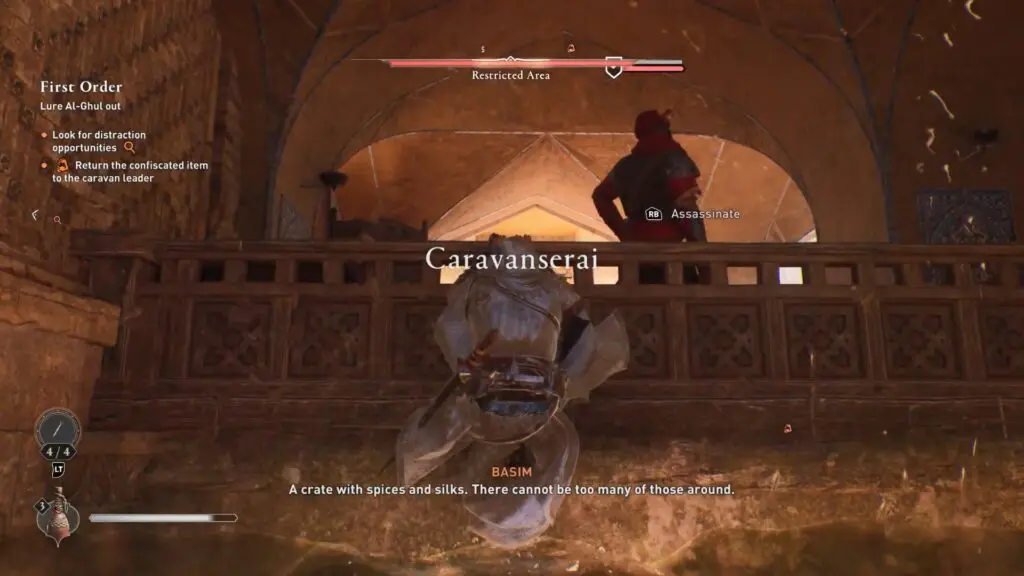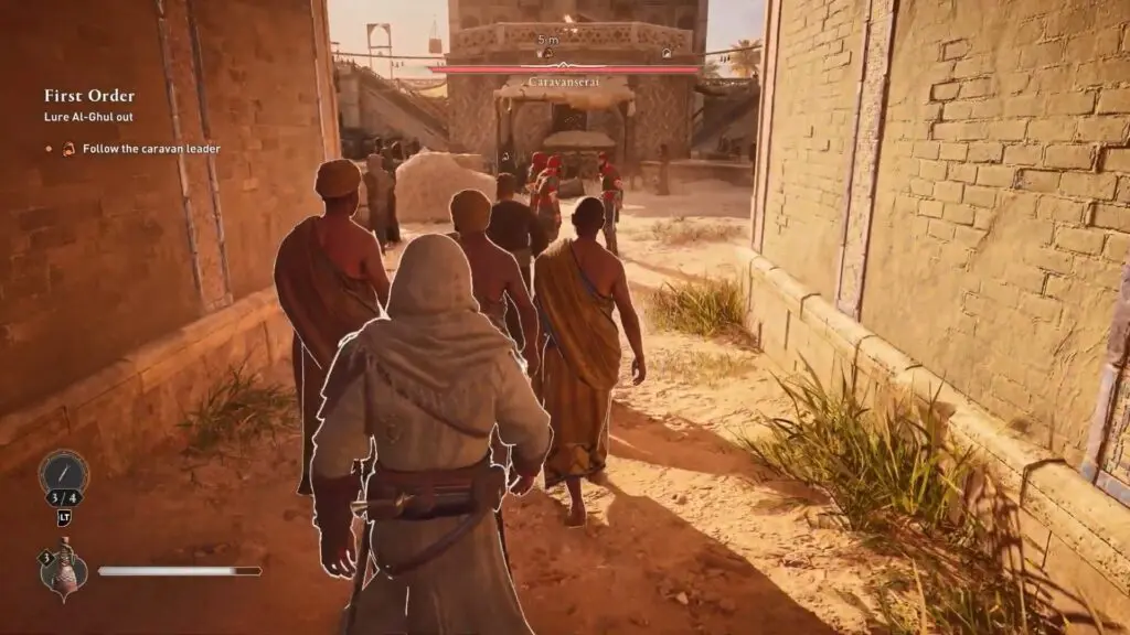 Give the goods to the merchant to create your distraction. He’ll tell you to follow him inside the Caravanserai. Merge with the group of merchants trailing behind him and follow their path. They will lead you to the center of the Caravanserai, and it is during this moment that Al Ghul makes an appearance.