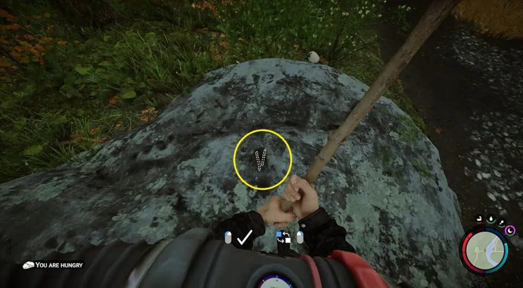 Once you have 2 Sticks, open your inventory and click on a Stick to equip it. You will be presented with two options in the form of small white lines on the ground. The circular option will result in the stick being inserted vertically into the soil, whereas the other option (two sticks marker) involves snapping the stick in half and placing the pieces on the ground.