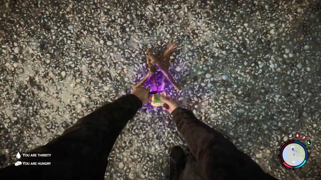 To make a fire, you have to use two sticks marker option. You can right-click while looking down at the ground to switch between the various actions available. Keep right-clicking until the white dotted marker indicates two small sticks adjacent to each other appear. Next, left-click to snap the stick in half and place them on the ground.