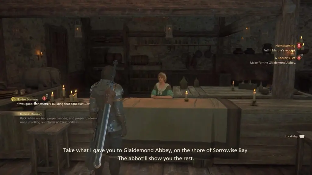 Martha requests that you visit Glaidemond Abbey on the shores of the Sorrowise area and speak with the abbot.