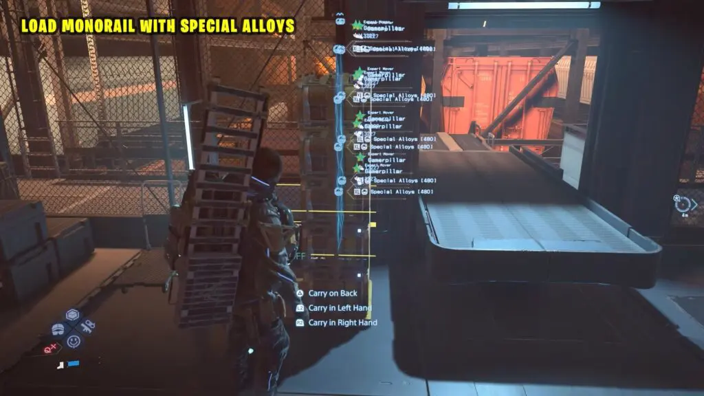 Go to the Special alloy you received after mining. Select the special alloys and choose the “Carry on Back” option. This will load the special alloys on your back.