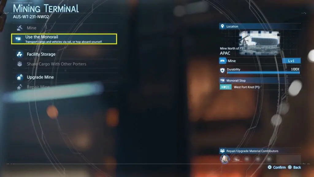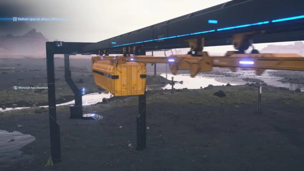 Now, interact with the access terminal again and select the option ‘Use the Monorail’. Then select the destination and the cargo to be loaded on the monorail. This will also hang you on the monorail