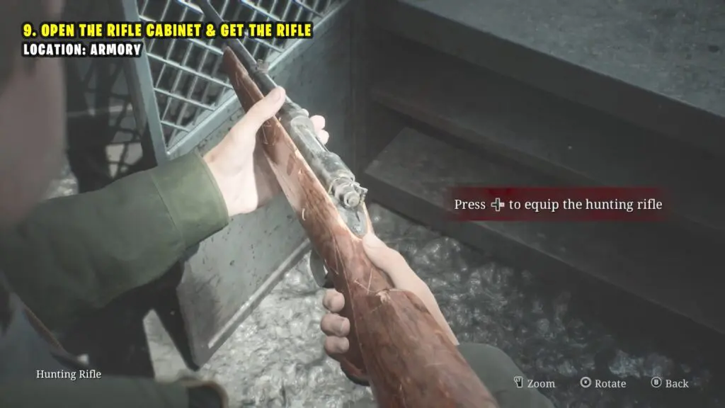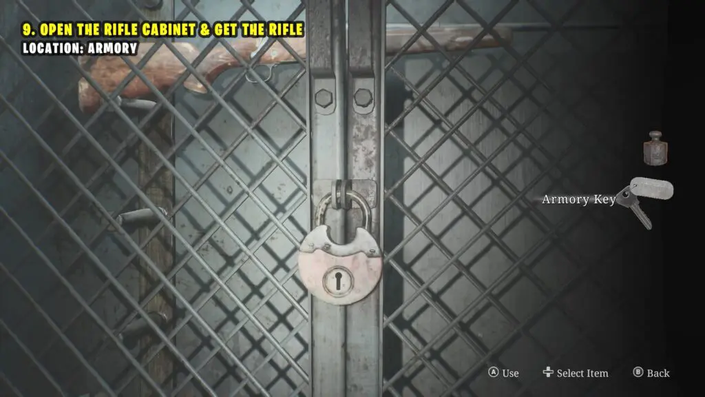 Now, Go through the door on the right of the key case and unlock the door at the end. The Armory room is on the right. Use the Armory Key to open the Cabinet & grab the Rifle